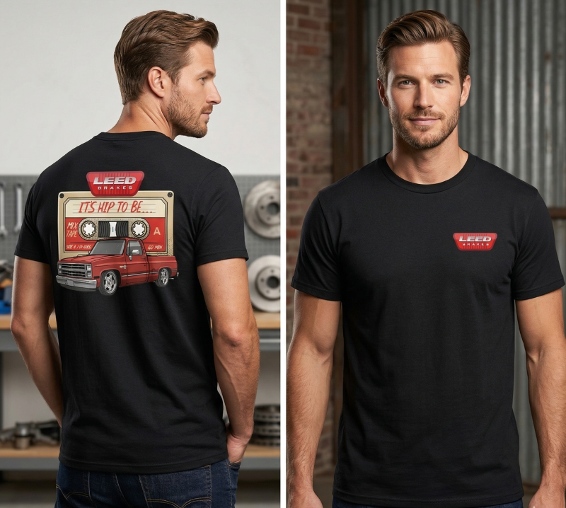 Our "C10 Vintage Cassette" shirt features a classic automotive-inspired design on the back, along with the LEED Brakes insignia on the front left chest. When you wear this automotive-themed t-shirt you'll show the classic car community you ride with the best brakes around!